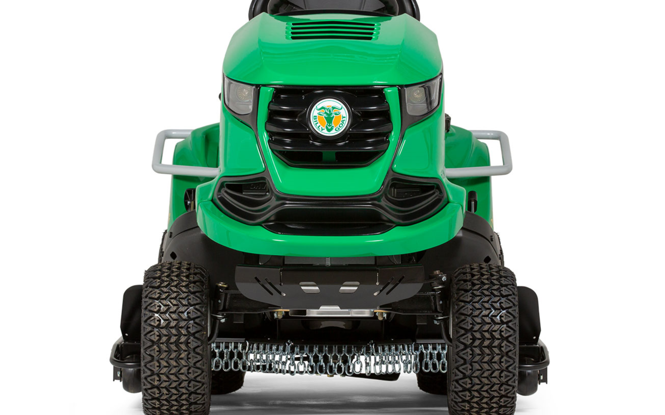 The strong fabricated mower deck with open front design discharges grass clippings rearwards. The three mower spindles host cross blades that are positioned at an offset cutting height. This enhances its performance in high grass conditions with excellent particle reduction, and also performs well at nicely manicured lawns.