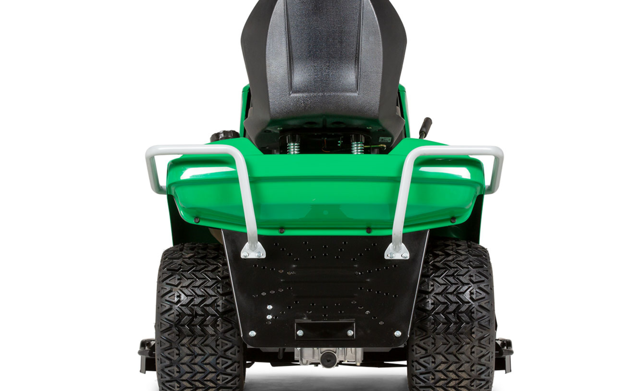 The rigid protection rail wraps around the seat deck protecting both the machine and the operator. It also serves as a secure grip on the machine, i.e. if you need to lean outwards while mowing edges.